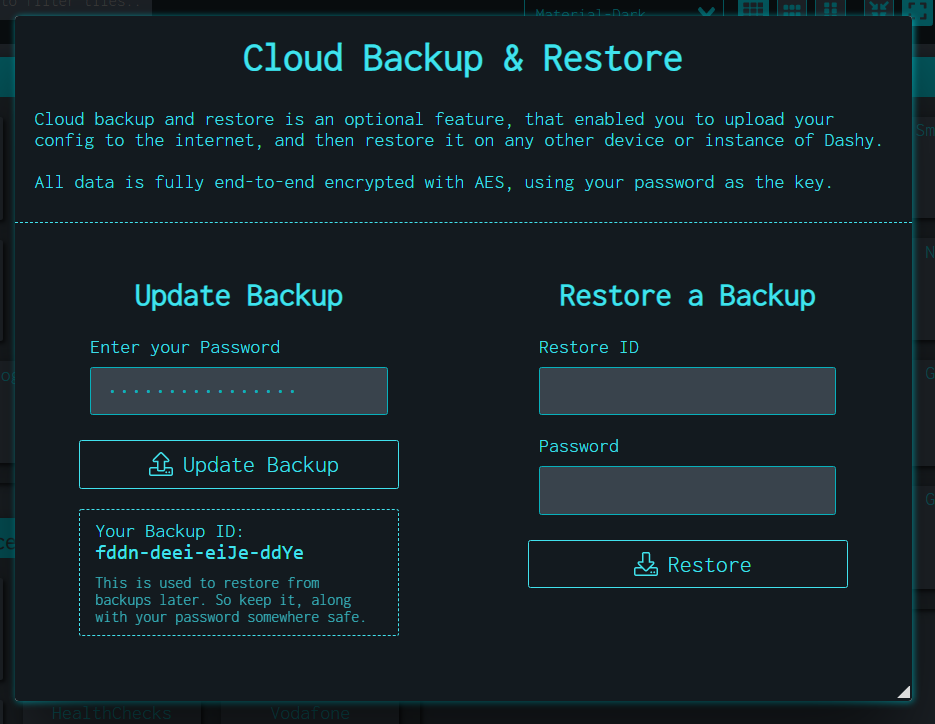 Once you've got Dashy configured to your preference, open the Backup & Restore menu (click the Cloud icon in the top-right corner). Here you will be prompted to choose a password, which will be used to encrypt your data. If you forget this password, there will be no way to recover your config. After clicking 'Backup' your data will be encrypted, compressed and sent to the hosted cloud service. A backup ID will be returned (in the format of xxxx-xxxx-xxxx-xxxx), this is what you use, along with your password to restore the backup on another system, so take note of it. To update a backup, return to this menu, enter your password, and click 'Update Backup'.