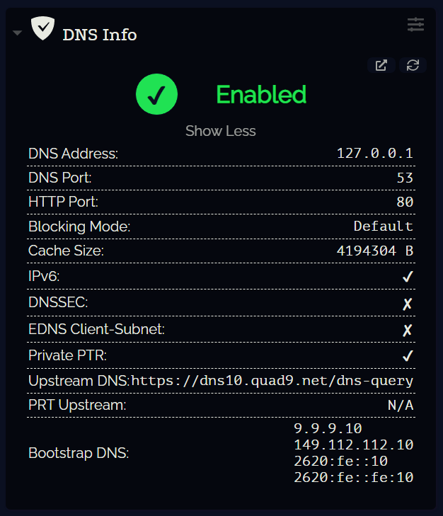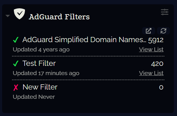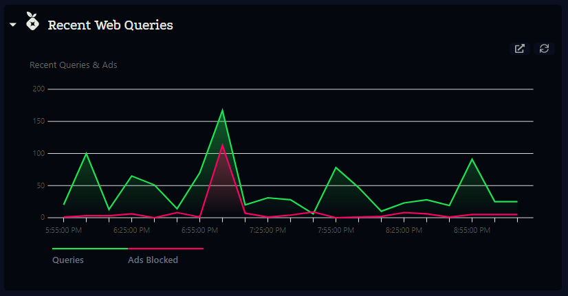widgets:- type: pi-hole-stats updateInterval: 20 options: hostname: http://192.168.130.2Note that if you have many widgets, and set them to continuously update frequently, you will notice a hit to performance. A widget that relies on data from an external API, will also consume your usage quota faster, if set to keep updating.