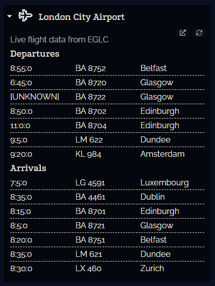 sections:- name: Today icon: far fa-calendar-day widgets: - type: clock options: format: en-GB - type: weather options: apiKey: xxxxxxxxxxxxxxxxxxxxxxxxxxxxxxxx city: London units: metricIn this example, there is a single section, named "Today", using a Calendar icon from Font-Awesome. It has 2 widgets, a clock and the current weather.