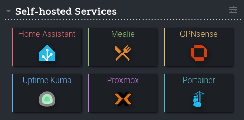 sections:- name: Simple Icons Example items: - title: Portainer icon: si-portainer - title: FreeNAS icon: si-freenas - title: NextCloud icon: si-nextcloud - title: Home Assistant icon: si-homeassistantGenerative Icons#
