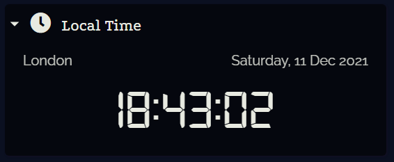 - type: clock options: timeZone: Europe/London format: en-GB hideDate: falseInfo#