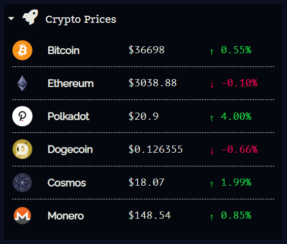 - type: embed options: css: '.coinmarketcap-currency-widget { color: var(--widget-text-color); }' html: '<div class="coinmarketcap-currency-widget" data-currencyid="1" data-base="USD" data-secondary="" data-ticker="true" data-rank="true" data-marketcap="true" data-volume="true" data-statsticker="true" data-stats="USD"></div>' scriptSrc: 'https://files.coinmarketcap.com/static/widget/currency.js'You can also use this widget to display an image, wither locally or from a remote origin.