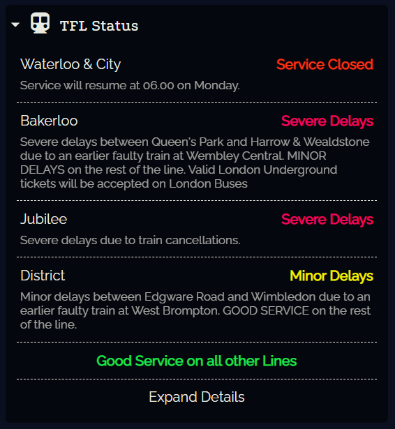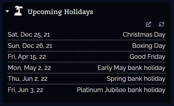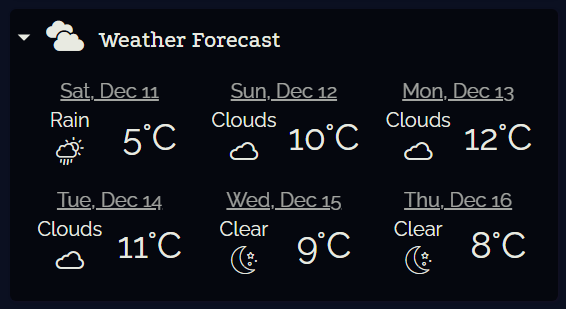 sections:- name: Today icon: far fa-calendar-day widgets: - type: clock options: format: en-GB - type: weather options: apiKey: xxxxxxxxxxxxxxxxxxxxxxxxxxxxxxxx city: London units: metricIn this example, there is a single section, named "Today", using a Calendar icon from Font-Awesome. It has 2 widgets, a clock and the current weather.