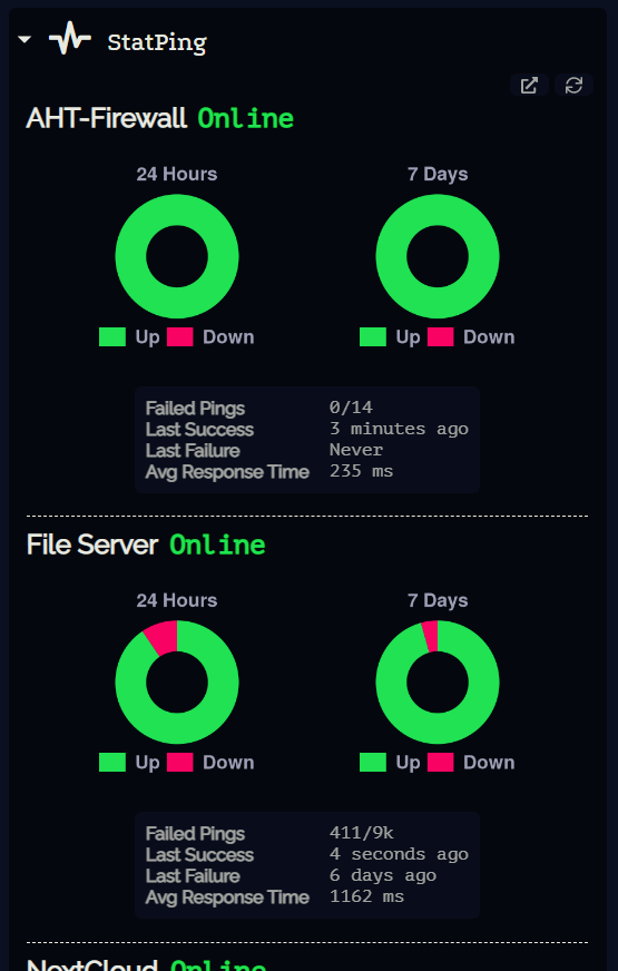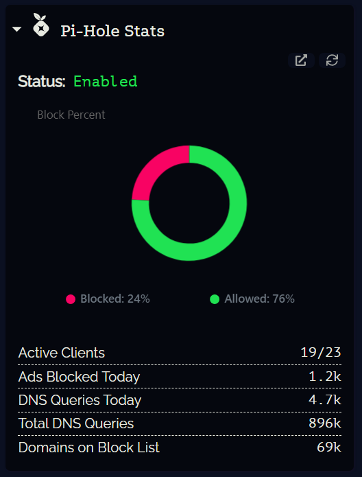 widgets:- type: pi-hole-stats updateInterval: 20 options: hostname: http://192.168.130.2Note that if you have many widgets, and set them to continuously update frequently, you will notice a hit to performance. A widget that relies on data from an external API, will also consume your usage quota faster, if set to keep updating.